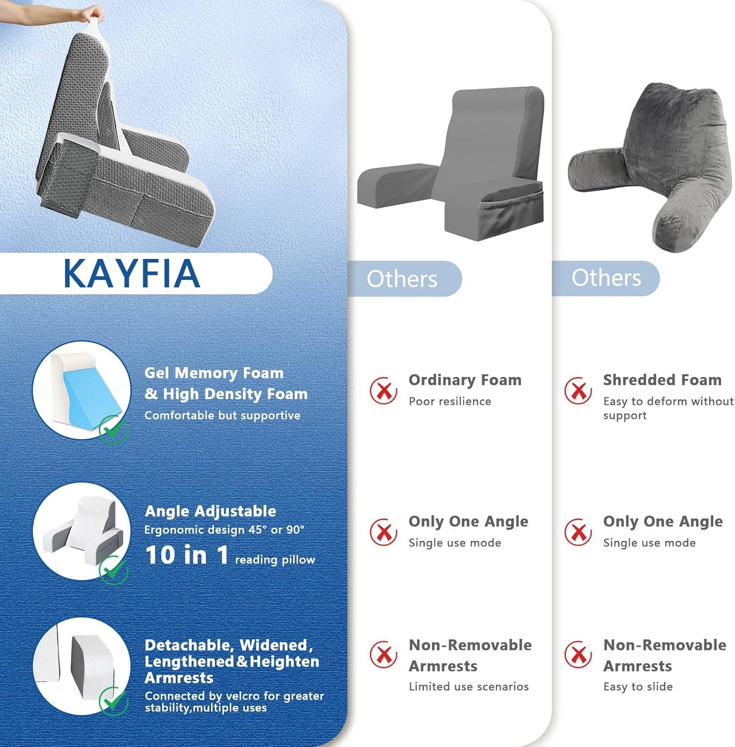 Kayfia Reading Pillow, 10 in 1 Back Pillow for Bed Sitting up with Detachable Arms Rest, Back Rest with Gel Memory Foam, Husband Pillow for Reading/Gaming/Working in Bed or Couch 19″, Gray(Gray)