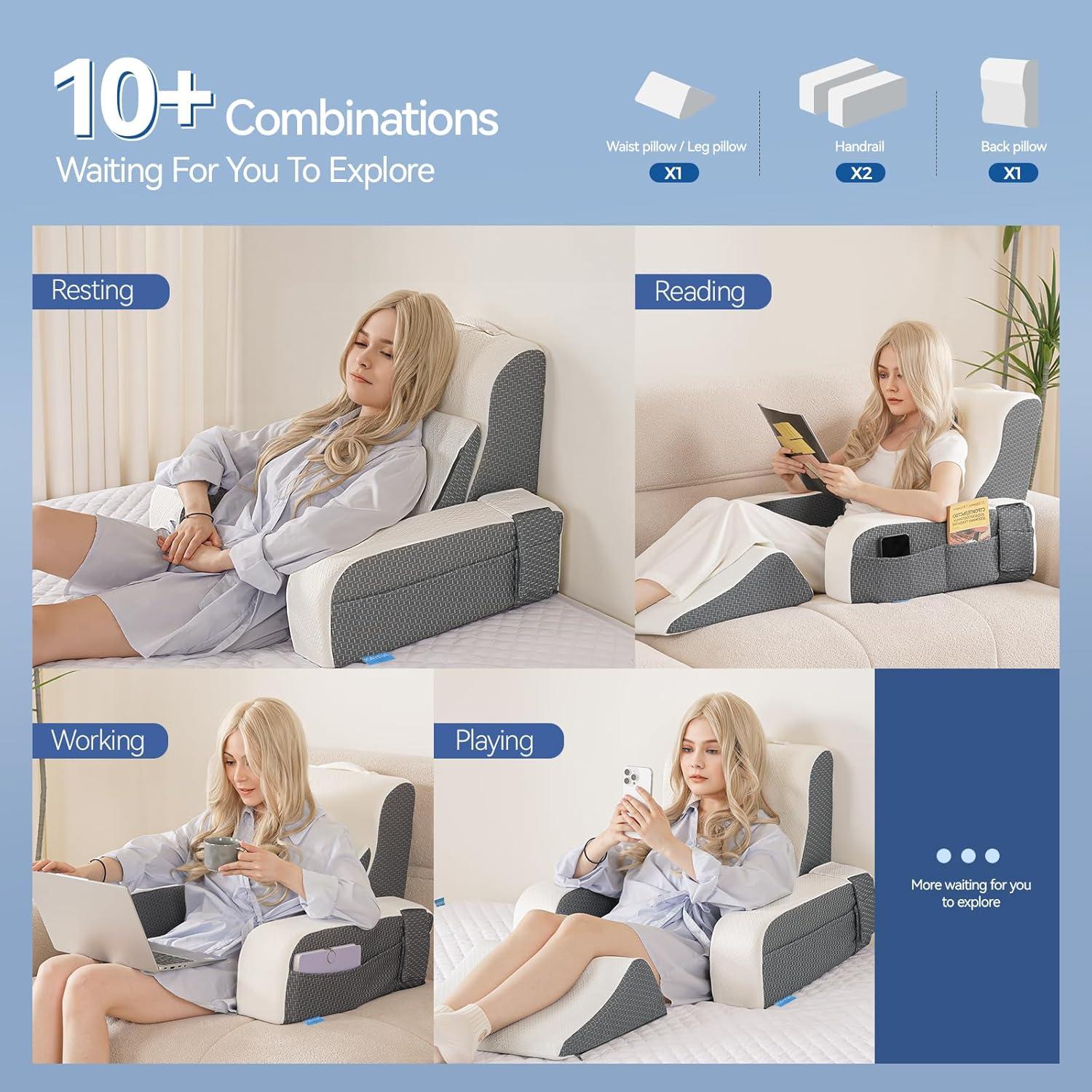【 Ergonomic Design & 10-in-1 Use 】The reading pillow is ergonomically designed and offers more than 10 usage methods from 2 angles to meet your different posture needs. When the backrest is at a 45° angle, it's suitable for a semi-reclining position. You can also convert the detachable backrest into a leg rest to obtain leg support. At this time, the angle of the backrest is close to 90°, which is more suitable for sitting use. The 2 angles and multiple combinations all seamlessly fit the natural curves of your head, neck, shoulders, back and waist, allowing you to feel extremely relaxed and comfortable when reading, working or resting. Enjoy it and explore more comfortable configurations